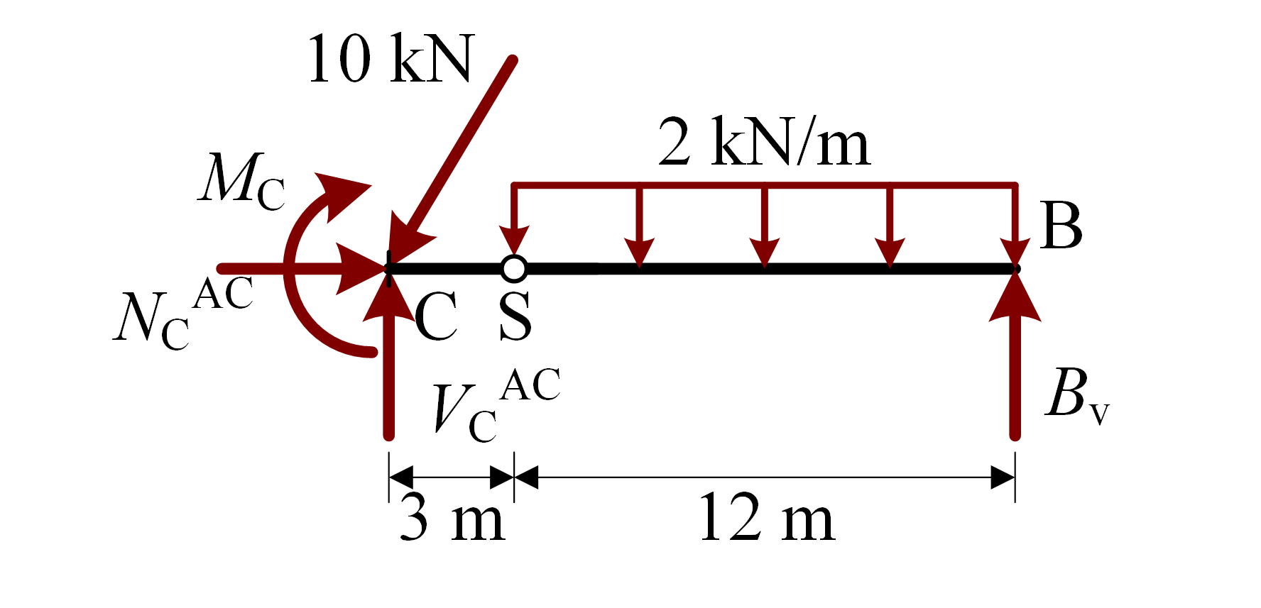 The free body diagram to the right of a cut just left of point \(\text{C}\) of the example model is shown in Fig. 13.
