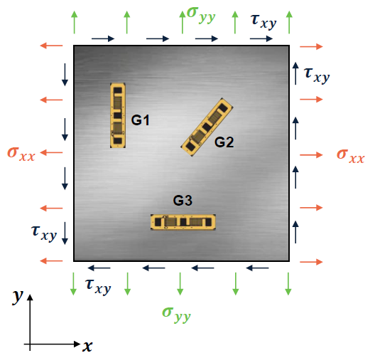 Fig. 195 Aluminium plate with strain gauges: \(E = 70 \ \rm{ GPa}\), \(\nu = 0.33 \ \rm{(-)}\), \(\varepsilon_{\rm{G1}} = -1.0 \cdot 10^{-3}\), \(\varepsilon_{\rm{G2}} = 2 \cdot 10^{-3}\), \(\varepsilon_{\rm{G3}} = +2 \cdot 10^{-3}\).#