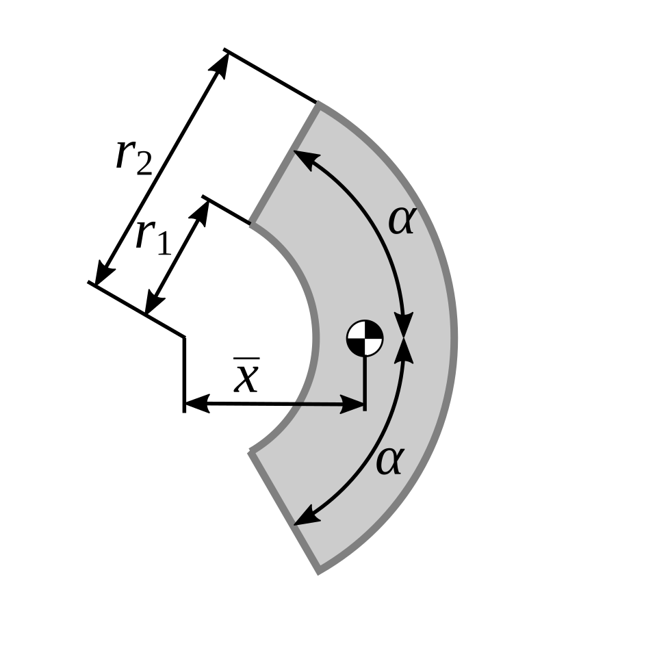 Fig. 41 Zwaartepunt \(\bar{x}\) van een ringsegment met binnenste straal \(r_1\), buitenste straal \(r_2\) en totale hoek \(2\alpha\).