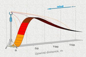 The analyzer and the thermocouple should be installed close or at the height of the anemometer for accurate results. The gas analyzer uses the spectral properties of water vapor and CO\(_{2}\) in the infrared region to measure the concentration. To avoid rainfall accumulating on the IR transmitter, the gas analyzer is often installed on a small inclination. The entire installation is installed on a tower (flux tower). The height of the tower is determined by the so-called flux footprint or fetch (Fig. 5.12). The footprint is the area that the sensors ‘see’ and should contain the area of interest. If the tower is too high the sensors ‘see’ outside the area of interest, or ‘see’ flows that are unaffected by the surface. On the other hand, if the tower is too low small eddies may not be registered (Burba, G. and Anderson, D., 2010). The footprint can be calculated (Schuepp et al., 1990) and is mainly dependent on the measuring height, the surface roughness and the atmospheric thermal stability.