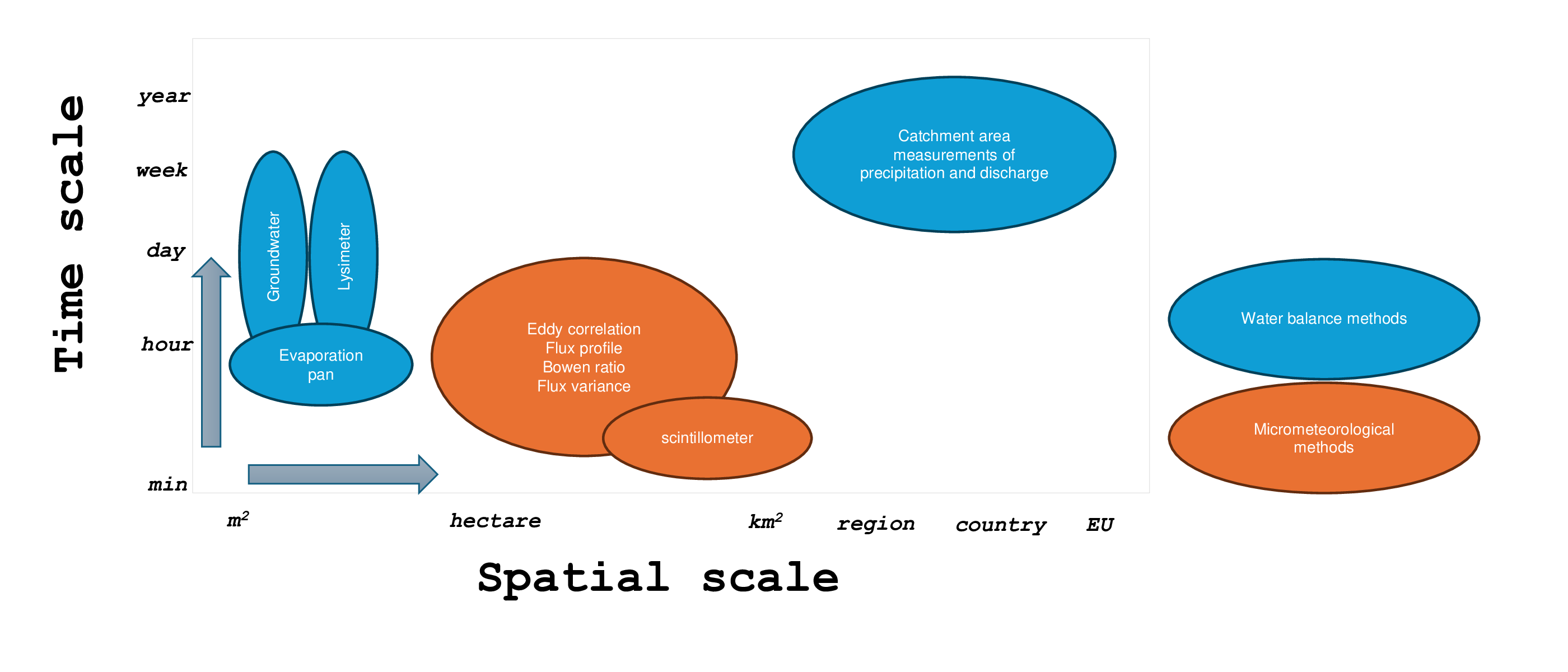 There are various methods to measure evaporation. They can be classified into two categories: methods that are based on the water balance or those that make use of micro-meteorological techniques. Depending on the spatial and temporal scale a method can be more or less suitable. In Fig. 5.7 an overview is given. In general, you can say that the water balance methods work well at either the larger catchment scale or at the smaller spatial scales (m\(^2\) to hectares). While the micro-meteorological methods nicely fill the gap between the hectare to km\(^2\) scale. In the temporal domain, the micro-meteorological methods perform better at time scales less than a day, while the water balance methods can expand to the yearly scale.