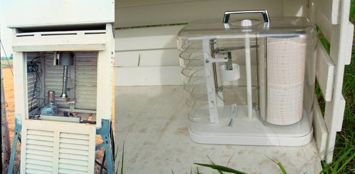b.4. Temperature: The saturated vapor pressure of the air is a function of the temperature of the air (\(T_a\)). The longwave radiation is temperature-dependent as well. To measure the temperature properly, only air temperature has to be measured, hence the energy should be supplied by convection and not by radiation, condensation or conduction. For that, the thermometer needs to be naturally ventilated and sheltered from sun and rain. This can be done according to the WMO standard in a ‘Stevenson shelter’ (Fig. 5.6).