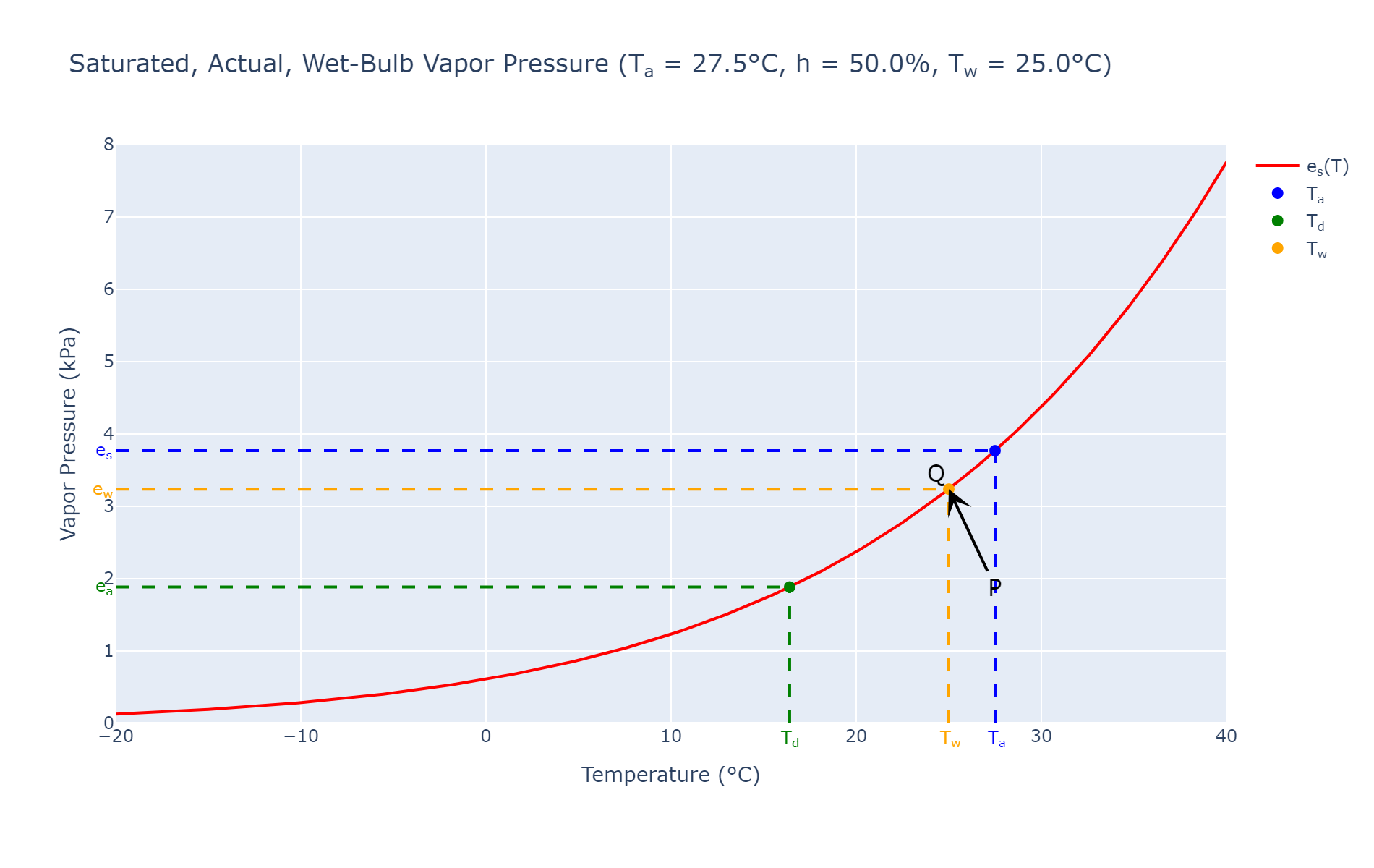 title=f"Saturated, Actual, Wet‐Bulb Vapor Pressure (Tₐ={T_a}°C, h={h_fixed}%, T_w={T_w_fixed}°C)",
