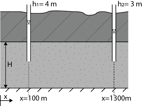 In practice, the flow in an aquifer in a certain direction can be measured with two piezometers, as shown in Fig. 6.15. If the hydraulic conductivity \(k\) (12 m/d) and the thickness of the aquifer \(H\) are known (5 m), the discharge per meter aquifer width can be calculated based on the hydraulic head measurements in two different ways.