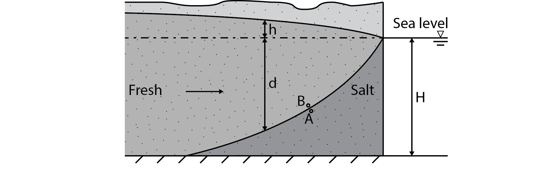 It is important to know the location freshwater lens for agriculture and drinking water production. Using some simplifications, the Badon Ghijben-Herzberg principle (De Vries, 1994) can be used to describe the shape of the freshwater lens as shown in Fig. 6.24. Steady-state is assumed with a hydrostatic equilibrium between the fresh and salt water. The transition from fresh to salt water is instantaneous, so no transition zone is present.