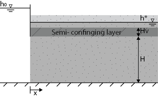 Let us assume one-dimensional flow from a canal into a polder as in Fig. 6.22. The aquifer is semi-confined and semi-infinite and is bounded on the left with a fully penetrating canal with water level \(h_0\). The water level in the polder is fixed at \(h^*\). At a large distance from the canal, the water level in the aquifer is equal to the water level in the canal. The following boundary conditions are used: