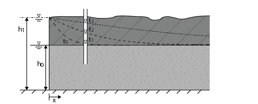 with \(Q\) the discharge of the well [m\(^3\)/day], \(k\) the hydraulic conductivity of the soil [m/d], \(H\) the thickness of the aquifer [m], \(r\) the distance from the well [m] \(r_0\) the radius of the well [m] and \(h_0\) the head in the well.