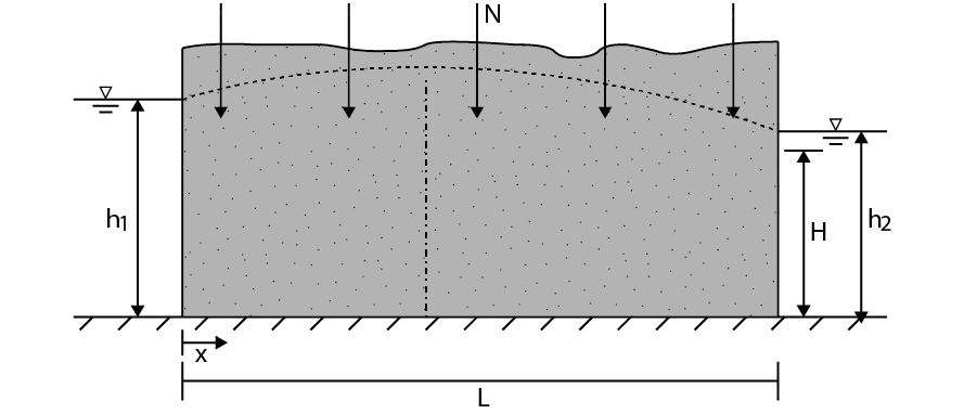 The same approach can be taken when recharge of groundwater \(N\) (NL: grondwateraanvulling) is present. Recharge is the extra inflow or outflow of water through the upper boundary. In case of infiltration of water into the aquifer, the recharge is positive. In the case of soil evaporation or transpiration or groundwater extraction with wells, the recharge is negative. Similar to Laplace, continuity of mass and Darcy’s law are combined: