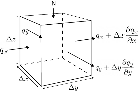 If we now substitute Darcy’s law for the flow in an aquifer (\(q_x = -k \frac{\partial h}{\partial x}\) and \(q_y = -k \frac{\partial h}{\partial y}\)) and assume that \(\Delta z\) is equal to the aquifer thickness \(H\) (for confined flow) we obtain: