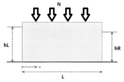 An aquifer is bounded by two long, deep rivers. The distance between the rivers is \(L\). Groundwater recharge is uniform everywhere and equal to \(N\). The water level in the river is \(h_l\) on the left and \(h_r\) on the right. The aquifer’s permeability is \(k\). The saturated thickness \(D\) of the aquifer can be approximated as constant. Groundwater flow in the aquifer is steady-state and one-dimensional. A vertical cross-section of the aquifer is shown in the figure, with the origin of the x-axis chosen as indicated.