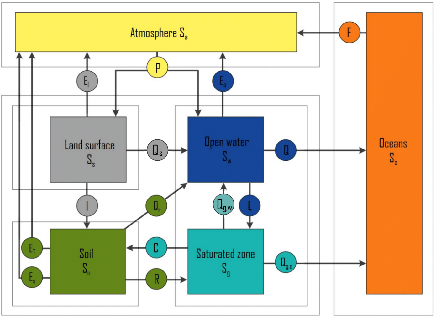 Due to climate change, some aspects of the water basin have changed: the interception rose by 20%, the infiltration fell by 10% and the precipitation rose by 10%. The rapid runoff through soil, river discharge and open water evaporation stayed constant.