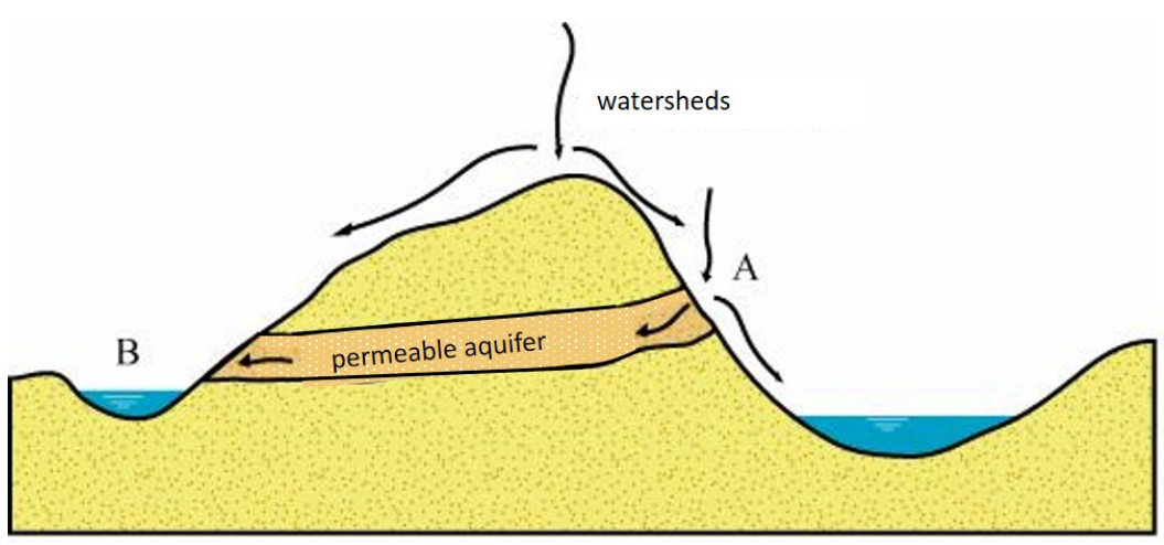 The system boundary can be different for different sub-water balances. For example, a river basin is bounded by a divide (NL: waterscheiding) defined by topography. This watershed determines the flow direction. The system boundary of groundwater systems is not necessarily determined by topography as shown in Fig. 2.5. Water infiltrated at one side of the topographic divide (A) can flow through an aquifer towards the other side of the topographic divide (B).