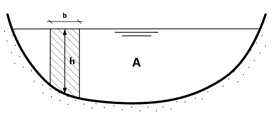 Fig. 7.13 Cross-section of a watercourse where area is divided in segments with height h and width b. (Own work)#