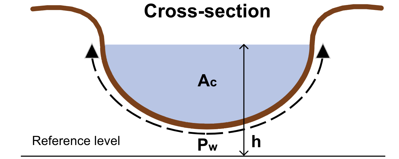 The river discharge \(Q\) is obtained by multiplying the average velocity over the vertical distance \(h\) by the area of the segment \(h \cdot b\), and then summing the discharges of all segments to obtain the total discharge across the cross-section \(A_c\). Therefore: