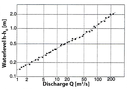 In Fig. 7.17, it can be observed that at an \(h-h_0\) value of approximately 0.7, a transition occurs to a different \(Q\) - \(h\) relationship. When such a transition can be clearly linked to an observed change in downstream boundary conditions such as a bridge blocking the flow, separate equations can be established for the different line segments. A change in the \(Q\) - \(h\) relationship opposite to Fig. 7.17 can also be caused by a significant alteration in the flow profile of a river, often associated with a distinct separation between a main channel or summer bed and the moment when the floodplains begin to flood, which have vastly different hydraulic properties. The above also implies that caution should be exercised when linearly extrapolating \(Q\) - \(h\) curves on a logarithmic scale.
