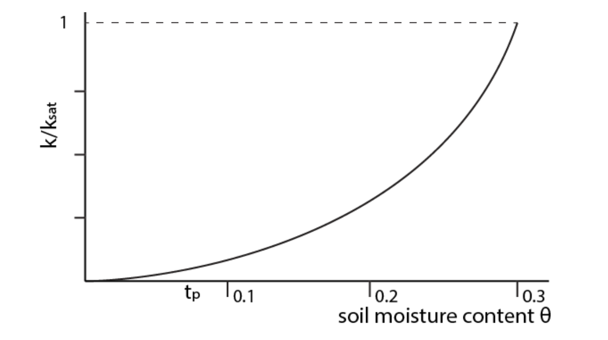 The relationship between the hydraulic conductivity and the soil moisture content is not linear. The small pores are filled first because the capillary forces are strongest in the smallest pores. As the larger pores are filled, the pores become interconnected and the hydraulic conductivity increases exponentially, as shown in the figure below.