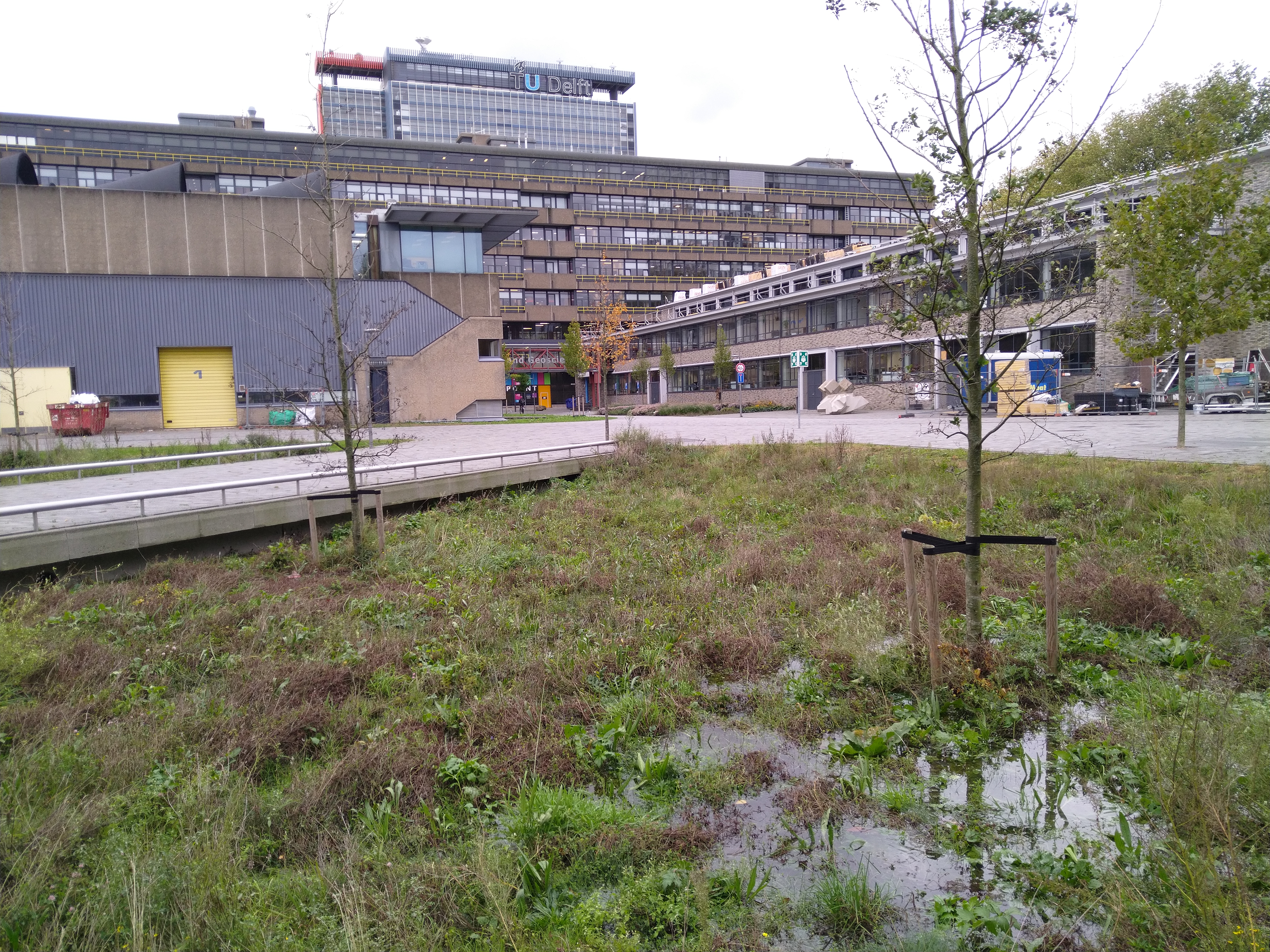 Fig. 8.2 An example of a bioswale at the TU Delft campus, outside the entrance of the Echo Building. The centre is lower than the pavement around it, allowing the water to run off into the bioswale, effectively increasing the depression storage capacity of the area. As can be seen, water is retained in the bioswale (see the bottom of the picture) and allowed to infiltrate. (Own work)#