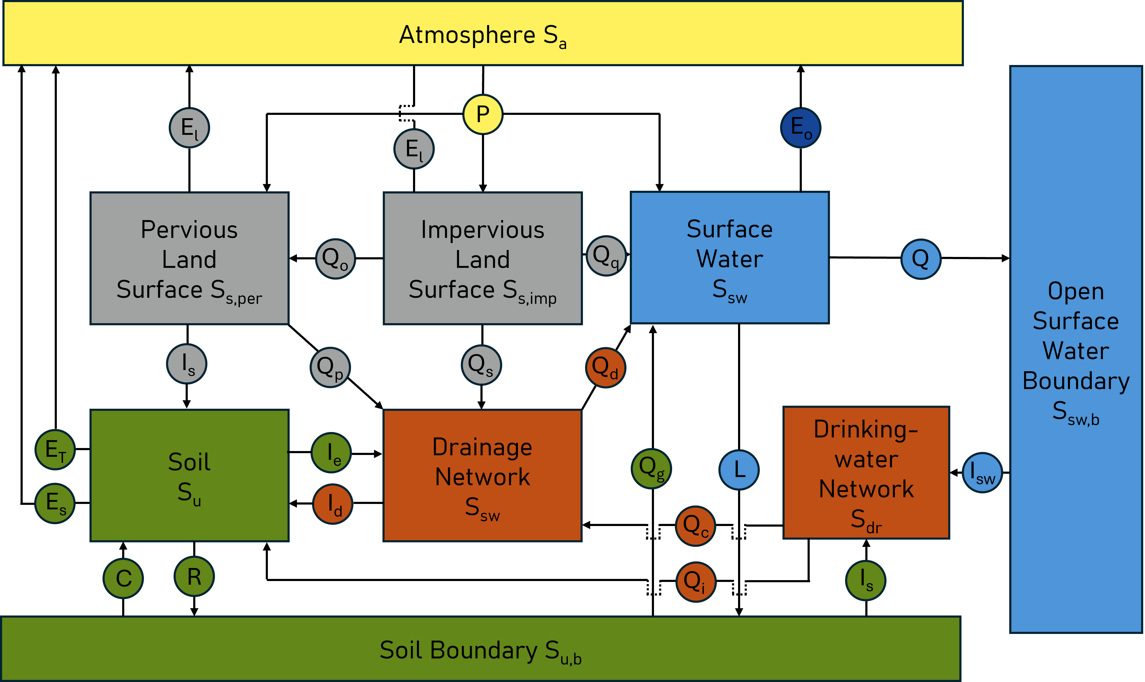 Most of the urban water balance is similar to the natural water balance, the overview of which is given in Section 2.2. The key differences are in the explicit discretisation of pervious (NL: doorlatend) and impervious (NL: verhard) areas, and in the inclusion of drainage networks and drinking water networks. The urban water cycle as a whole can again be understood as a water balance based on the principle of conservation of mass, again typically using volumes instead of masses. The water balance at each of the different storage processes is again: