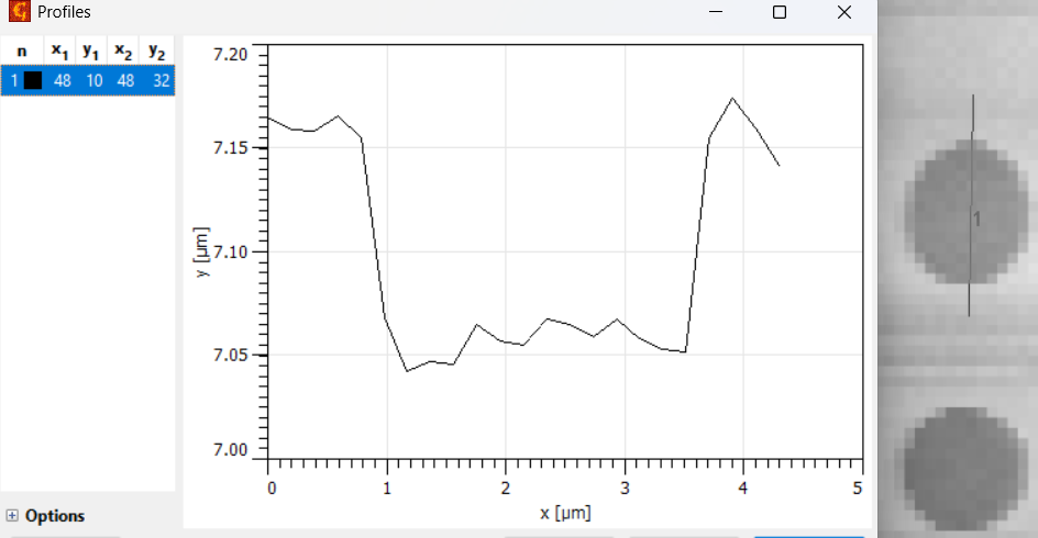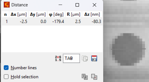 Zorg dat de instellingen passen bij het genomen sample. Druk vervolgens op Execute. Als het werkt dan zie je nu een preview en kun je op OK drukken. (Mocht je een foutmelding krijgen in de trant van CSV bestand klopt niet, controleer dit bestand eerst in Excel op het juiste aantal kolommen en rijen. Soms valt er magisch genoeg ééntje weg.)Op deze wijze kan gemeten worden hoe groot details zijn: Tools menu - tweede icoontje: Measure Distances…. Klik op een rand van een detail in je opname sleep naar een andere rand om zo de afstand ertussen te meten. Let op: Het window van afstand meten kan verdwijnen achter andere windows.