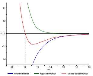 Als je alle bovengenoemde krachten optelt krijg je het bekende Lennard-Jones potentiaal, deze is te zien in de figuur hieronder. Zoals je kunt zien is de potentiaal afstotend voor hele kleine afstanden (de afstoting tussen atomen) en een aantrekkende kracht op grote afstand (van der Waalskracht en capillaire werking).
