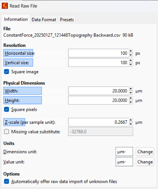Open de applicatie Gwyddion en kies: File - Open - selecteer het .csv-bestand. Klik linksonder op bestandstype: Raw data files en open het bestand.