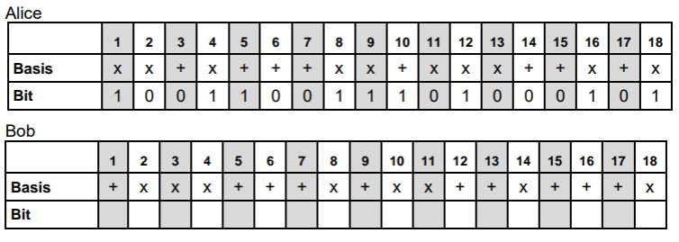 l. Alice en Bob wisselen openbaar hun basissen uit voor elke meting. Ze wissen vervolgens de metingen in de reeks waar de basissen niet overeenkomen.