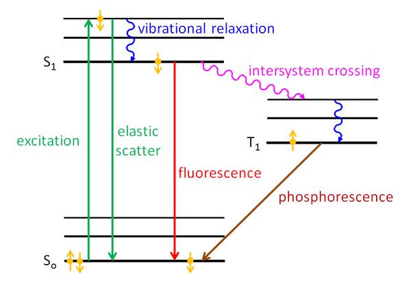 Bij fosforescentie gebeurt iets vergelijkbaars, echter dit proces duurt milisecondes tot uren. Hieronder staat het energiediagram (ook wel Jablonski diagram genoemd) weergegeven, wat daaronder verder wordt toegelicht.