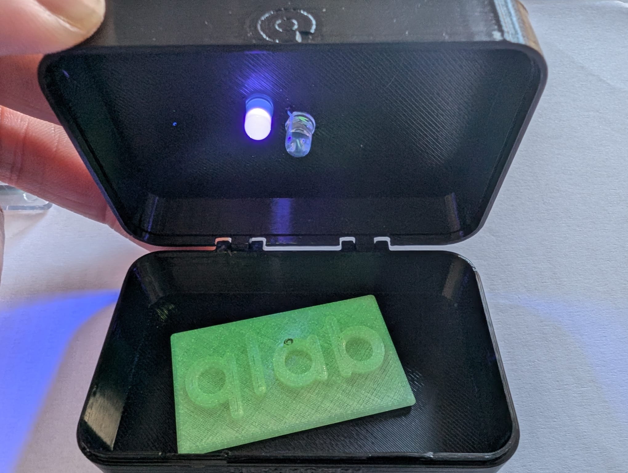 Bekijk de binnenkant: Beneden bevindt zich fosforescerend, zelfklevend papier. Aan de binnenkant van de deksel bevinden zich links een matte UVled en rechts de fototransistor.