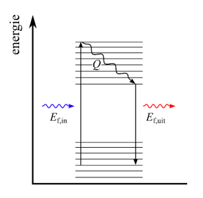 Fluorescentie wordt uitgebreid behandeld in de NLT-module Quantum Ready!. Hieronder zie je een fluorescentie-energiediagram uit deze module. Een foton brengt een molecuul in de aangeslagen toestand: Het elektron komt in een hoger energieniveau. Vervolgens komt er wat energie vrij Q via een stralingsvrije overgang. Tenslotte valt het elektron terug naar de grondtoestand onder het uitzenden van een foton (met minder energie en dus een andere kleur dan het oorspronkelijke foton). Dit is over het algemeen een proces dat nanosecondes duurt.