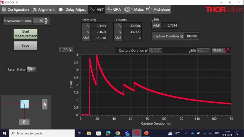 In het HBT-experiment worden gelijktijdige detecties (coïncidenties) onderzocht. Bij een coherente lichtbron zou je ongecorreleerde statistieken verwachten, terwijl bij quantumgecorreleerde of juist thermische lichtbronnen hiervan afwijken.