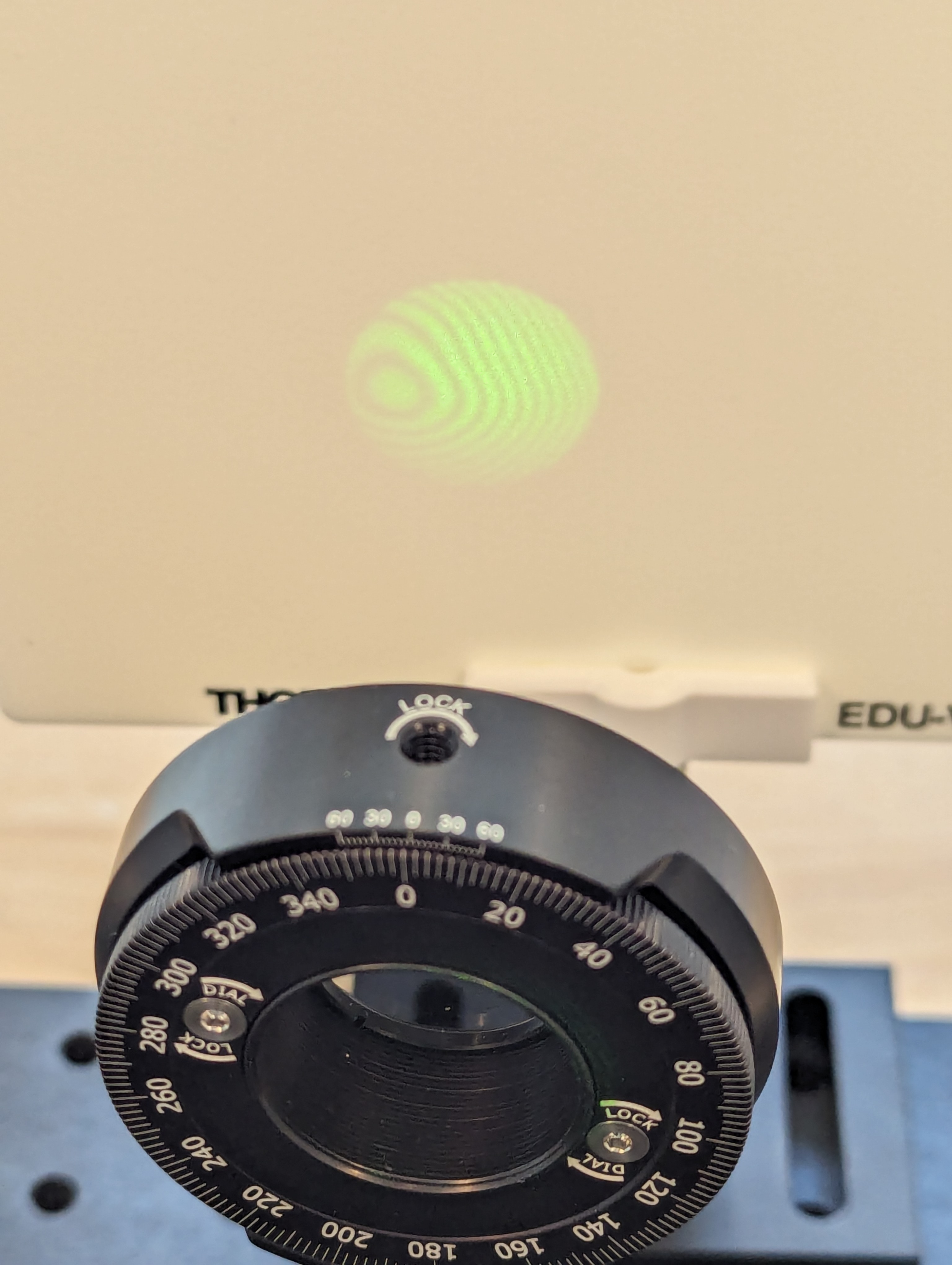 Figuur 2: Polarisator met daarachter op het scherm een ringvormig interferentiepatroon.