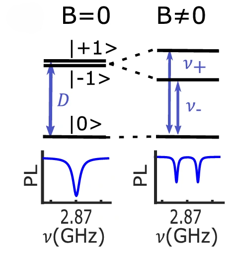 Door het aanbrengen van een extern magnetisch veld zullen de \(m_s = \pm1\) toestanden splitsen: Dit wordt zeemansplitsing genoemd (naar Pieter Zeeman). De mate van opsplitsing hangt af van de sterkte van het magneetveld in de richting van het NV-centrum (zie ook het andere NV experiment). Doordat dat de \(m_s =-1\) en de \(m_s=+1\) nu twee (gesplitste) verschillende toestanden zijn, zal het bereiken vanuit de \(m_s=0\) toestand van de \(m_s=+1\) toestand iets meer energie kosten en de \(m_s=-1\) iets minder energie kosten. Dus de microgolf zal in het ene geval moeten zorgen voor iets meer energie door een hogere frequentie en in het andere juist een lagere frequentie. Zie hieronder de afbeelding met extern magneetveld \(B=0\) en met extern magneetveld \(B\neq0\). De \(\nu\) is een symbool voor frequentie (wij gebruiken meestal \(f\)).