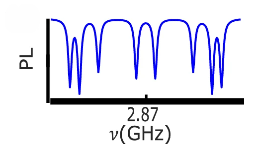 In het diagram hierboven is te zien dat de \(m_s=\pm1\) grondtoestand te bereiken vanuit de onderste grondtoestand \(m_s=0\) door de elektronen energie te geven met een microgolf frequentie van 2,87 GHz.