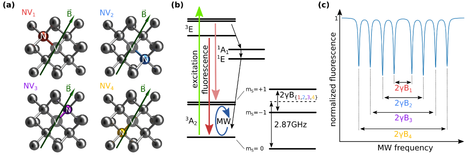In de figuur hieronder bij (a) de vier oriëntaties van de Nitrogen-Vacancy in het diamant kristalrooster. Bij (b) nogmaals het energiediagram. Bij (c) de 4 keer 2 dipjes in de waargenomen intensiteit die bij elkaar horen, waarbij \(\gamma\) de gyromagnetische verhouding is en \(B\) de magnetische veldsterkte.