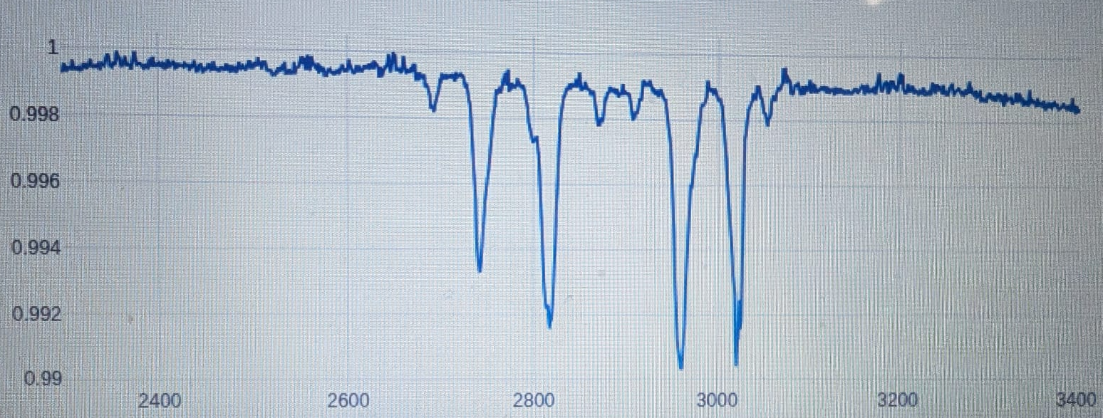 Probeer vervolgens de hyperfine-splitting van het Zeeman effect te ontdekken. Gebruik hiervoor de volgende instellingen: 10 loops, power 10, stepsize 0.1 MHz, magneetvoeding op 0.8 A (rechter LCD scherm van de voeding) en range 2800 tot 2940 MHz. Zet de voeding meteen uit als de meting klaar is.