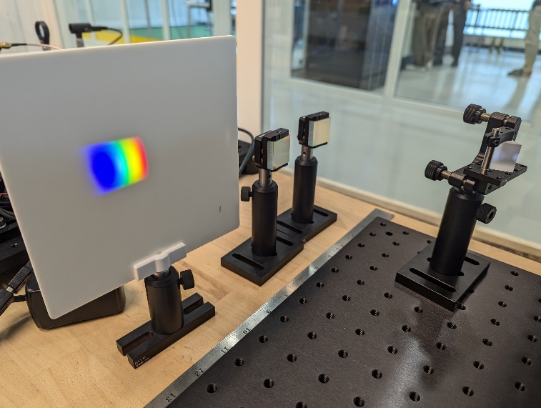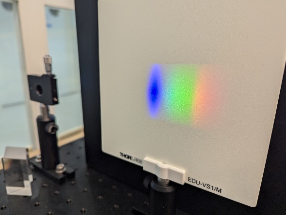 Plaats nu het prisma in de opstelling en verplaats het scherm. Zie ook de foto hieronder. De matte kant van het prisma wijst naar jou. Laat echter het filter op de LED zitten, dus zo’n mooi spectrum als op de foto is niet waarneembaar. (Op de foto is wel mooi zichtbaar dat de kleuren andersom zijn ten opzichte van proef 1).