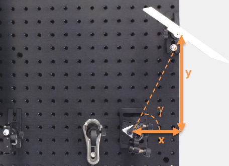 Meet de afstanden x en y zoals hieronder zijn aangeven. Let op: Zorg dat je x en y meet met een rechte hoek (90° ) ertussen. En bereken vervolgens hoek \(\gamma\) gamma.