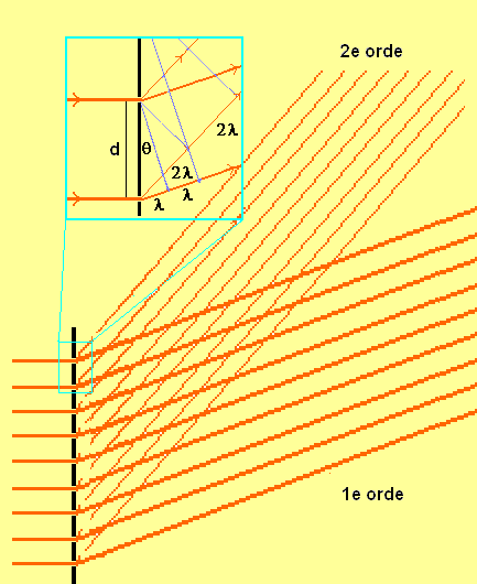 En wordt met 1e orde en 2e orde de maxima bedoeld waar constructieve interferentie optreedt door n\(\lambda\) weglengte verschil.