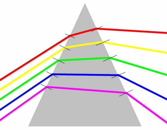 i de hoek van inval, r de hoek van breking (refractie) en n de brekingsindex van het materiaal. Aangezien de brekingsindex voor elke golflengte (en elk materiaal) anders is, zal bijvoorbeeld witlicht breken in zijn spectrum. Zie de figuur hieronder.
