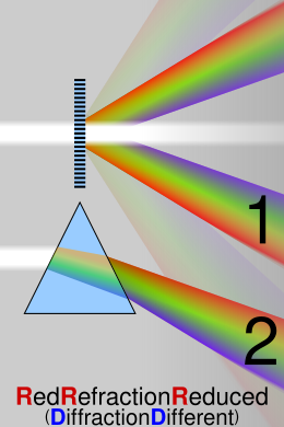 Bij een tralie treedt buiging van licht op, bij een prisma daarentegen breking. De brekingshoek kan worden berekend met behulp van de wet van Snellius: