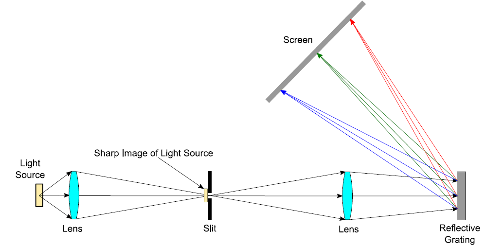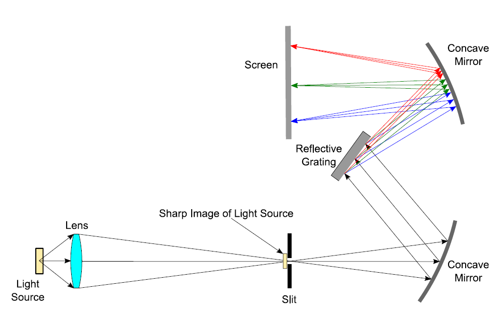 Elke spectrometer bestaat uit een manier om het licht van de lichtbron op te vangen, waarna het via een optisch element wordt geleid dat de licht anders buigt of breekt naar gelang de golflengte (een tralie, prisma of spiegeltralie). Tenslotte wordt dit licht opgevangen, bijvoorbeeld op een scherm of op een sensor.