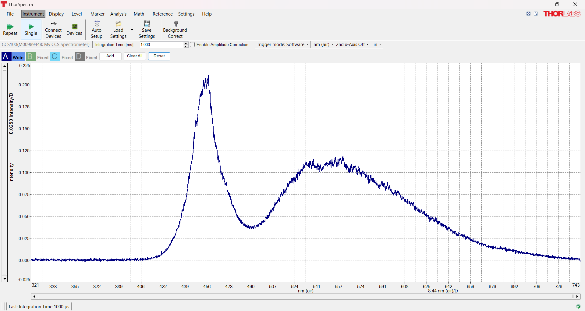 Als lichtbron wordt gebruik gemaakt van een witte LED. Het is mogelijk deze LED te voorzien van een groen bandpass filter van 532nm. De witte LED heeft het volgende spectrum: