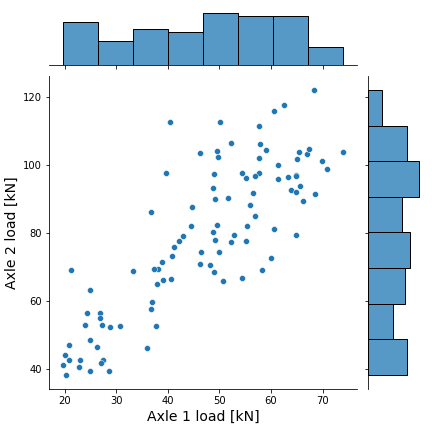 Scatter plot with marginal histograms representing the Axle 1 and Axle 2 measurements